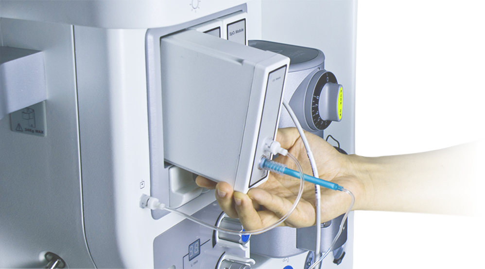 - Módulos Opcionales: La máquina también ofrece módulos opcionales, como el MainStream CO2 Module (Masimo IRMA), Multi-gas Module (Masimo IRMA), y Módulo de SpO2.