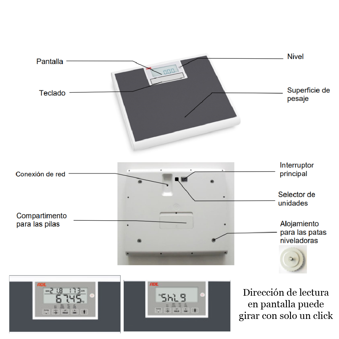 Funciones: IMC, pesaje madre e hijo, pantalla girable, hold & autohold, apagado automático